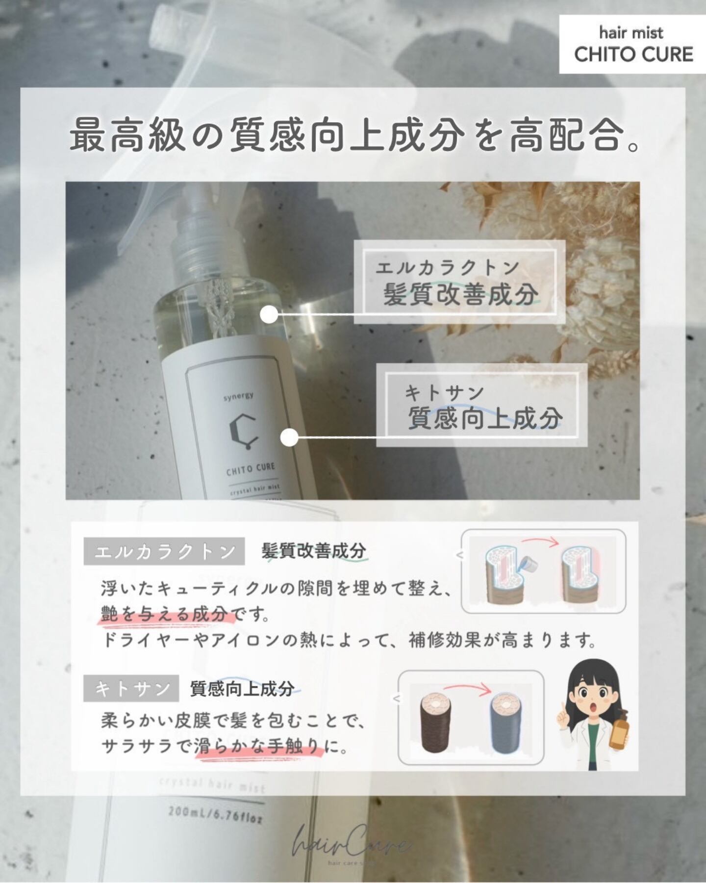 キトサンとエルカラクトンとその他の質感向上成分をバランスよくホームケア以上の高濃度で配合。