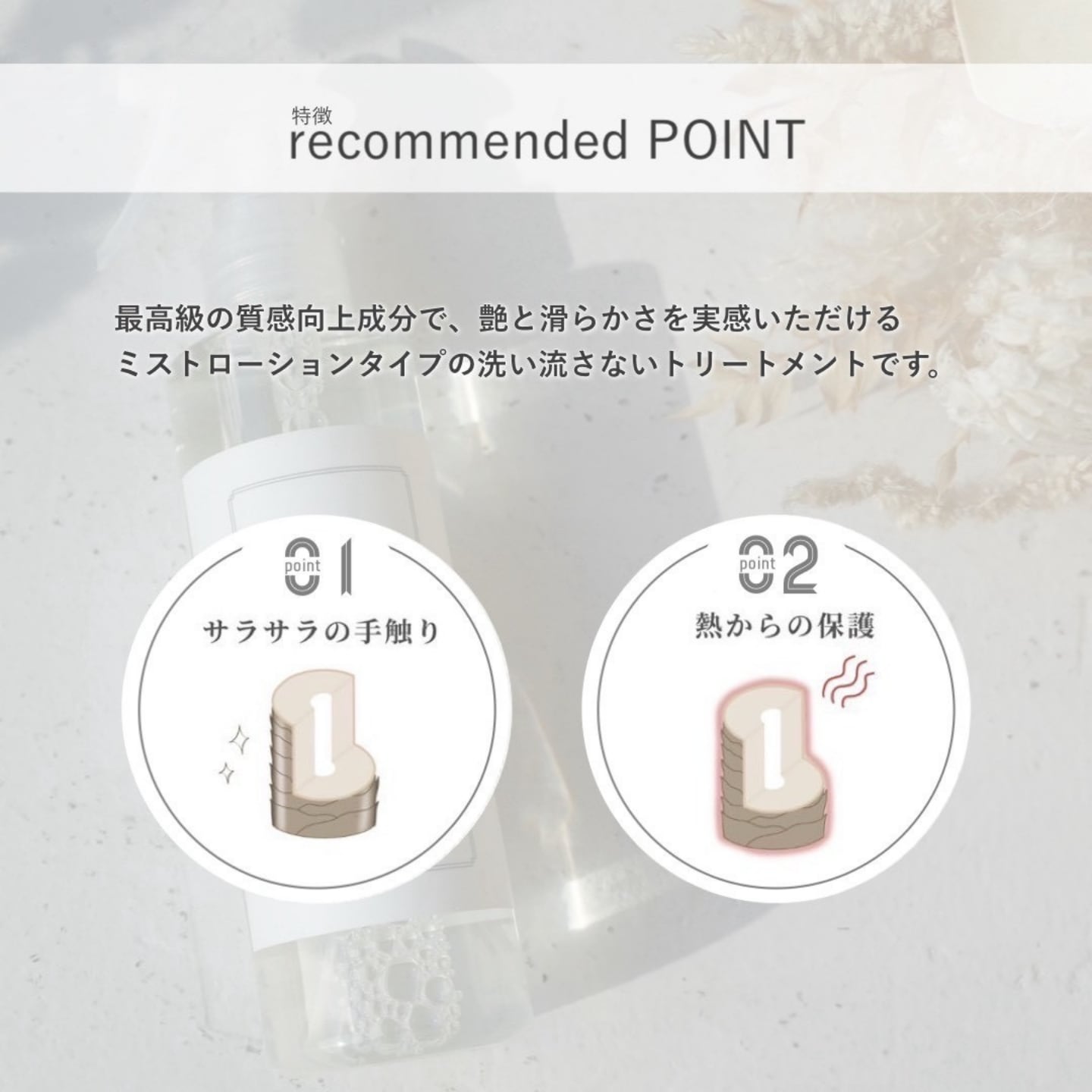ツヤと滑らかさを毛髪に与え、皮膜効果で熱からの保護。